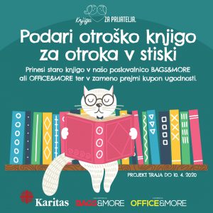 Od 1. marca do 10. aprila poteka zbiranje rabljenih otroških knjig v papirnicah Office&More in galanterijah Bags&More po vsej Sloveniji. Predali jih bodo slovenski Karitas, ta pa jih bo podarila otrokom, ki jih najbolj potrebujejo.